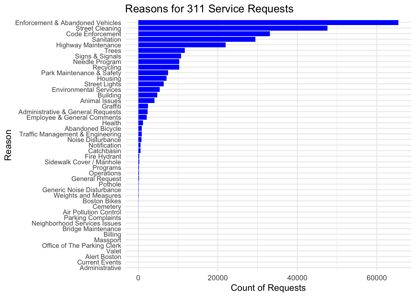 To gain a high-level overview, we plotted the counts for all 45 distinct reasons for requests in our dataset. The most common reason is “Enforcement & Abandoned Vehicles,” accounting for over 60,000 requests (22.5% of the total), followed by “Street Cleaning” and “Code Enforcement.”