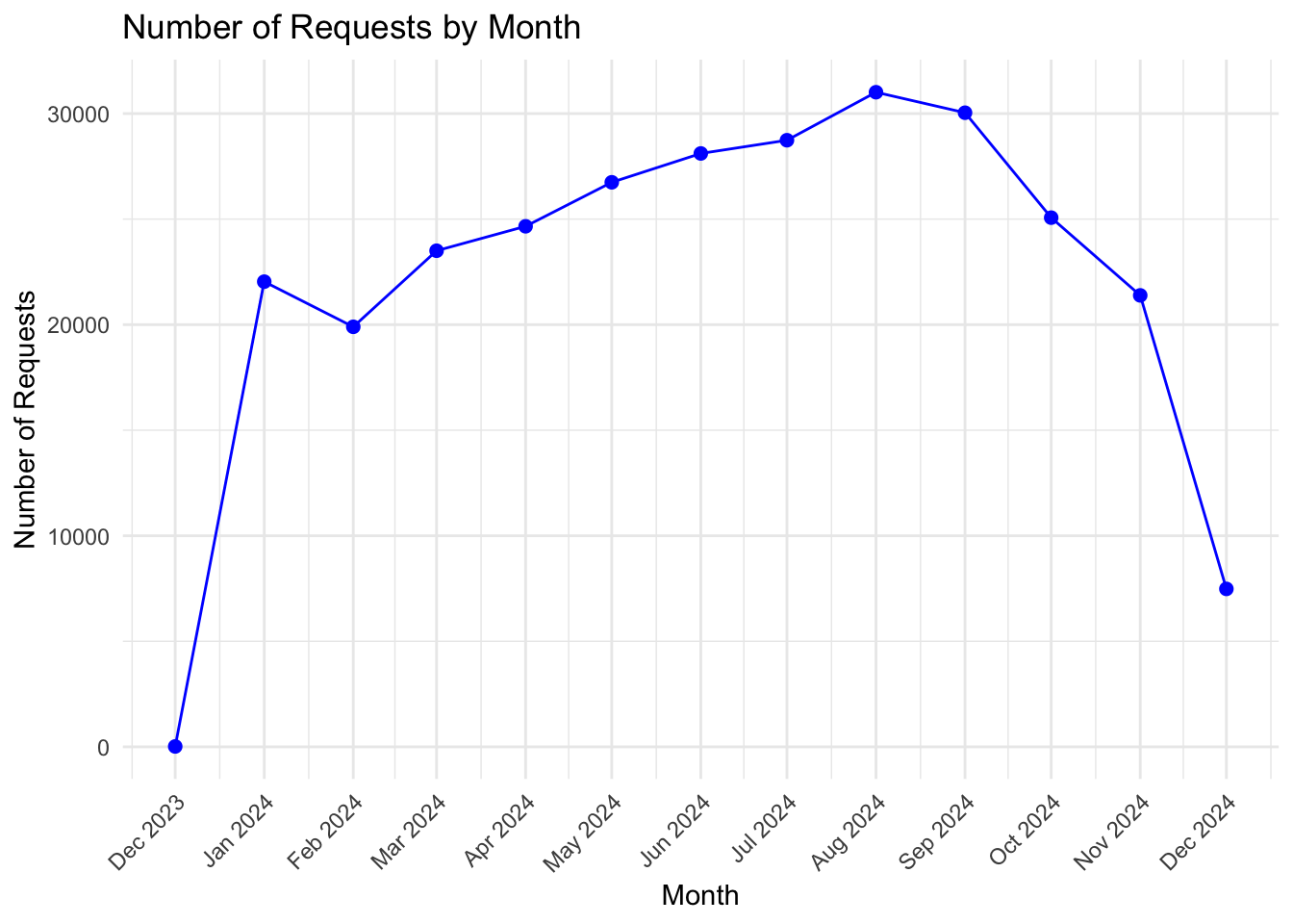 Since this dataset was pulled in November, we will assume the data for that month is incomplete. Nonetheless, the data shows a steady increase in the number of requests throughout 2024, peaking in August before declining. Perhaps this trend can be attributed to the warm weather. Warmer months, especially in summer, often bring increased outdoor activities such as public events, festivals, and tourism. These activities lead to a rise in noise complaints, trash collection requests, and reports of public infrastructure issues, explaining the upward trend in 311 requests as the weather gets warmer.