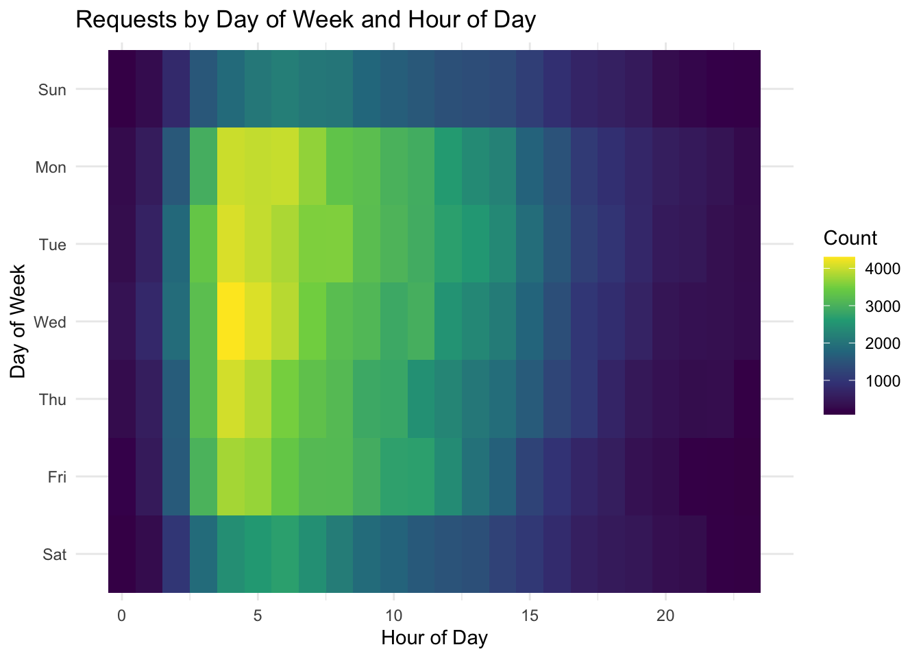df$day_of_week <-wday(df$open_dt, label =TRUE, week_start =1) # Monday = 1df$hour <-hour(df$open_dt)df$day_of_week <-factor(df$day_of_week, levels =c("Sun", "Mon", "Tue", "Wed", "Thu", "Fri", "Sat"))df$day_of_week <-fct_rev(df$day_of_week)heat_data <- df |>count(day_of_week, hour)ggplot(heat_data, aes(x = hour, y = day_of_week, fill = n)) +geom_tile() +scale_fill_viridis_c() +labs(title ="Requests by Day of Week and Hour of Day",x ="Hour of Day", y ="Day of Week", fill ="Count") +theme_minimal()