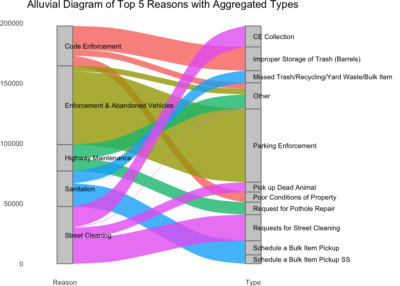 Note that since the “type” column contains too many categories and makes the alluvial chart unreadable, we aggregated less frequent categories into an “Other” category. Specifically, this alluvial diagram only shows the top 10 most frequent types, drawn from the subsetted dataframe of top 5 reasons.