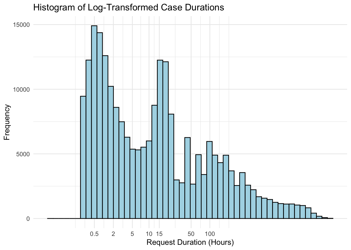df <- df |>mutate(duration_hours =as.numeric(difftime(closed_dt, open_dt, units ="hours")),log_duration =log1p(duration_hours)) ggplot(df, aes(x = log_duration)) +geom_histogram(binwidth =0.2, fill ="lightblue", color ="black") +labs(title ="Histogram of Log-Transformed Case Durations",x ="Request Duration (Hours)",y ="Frequency" ) +scale_x_continuous(breaks =log1p(c(0.5, 2, 5, 10, 15, 50, 100)),labels =c(0.5, 2, 5, 10, 15, 50, 100) ) +theme_minimal()