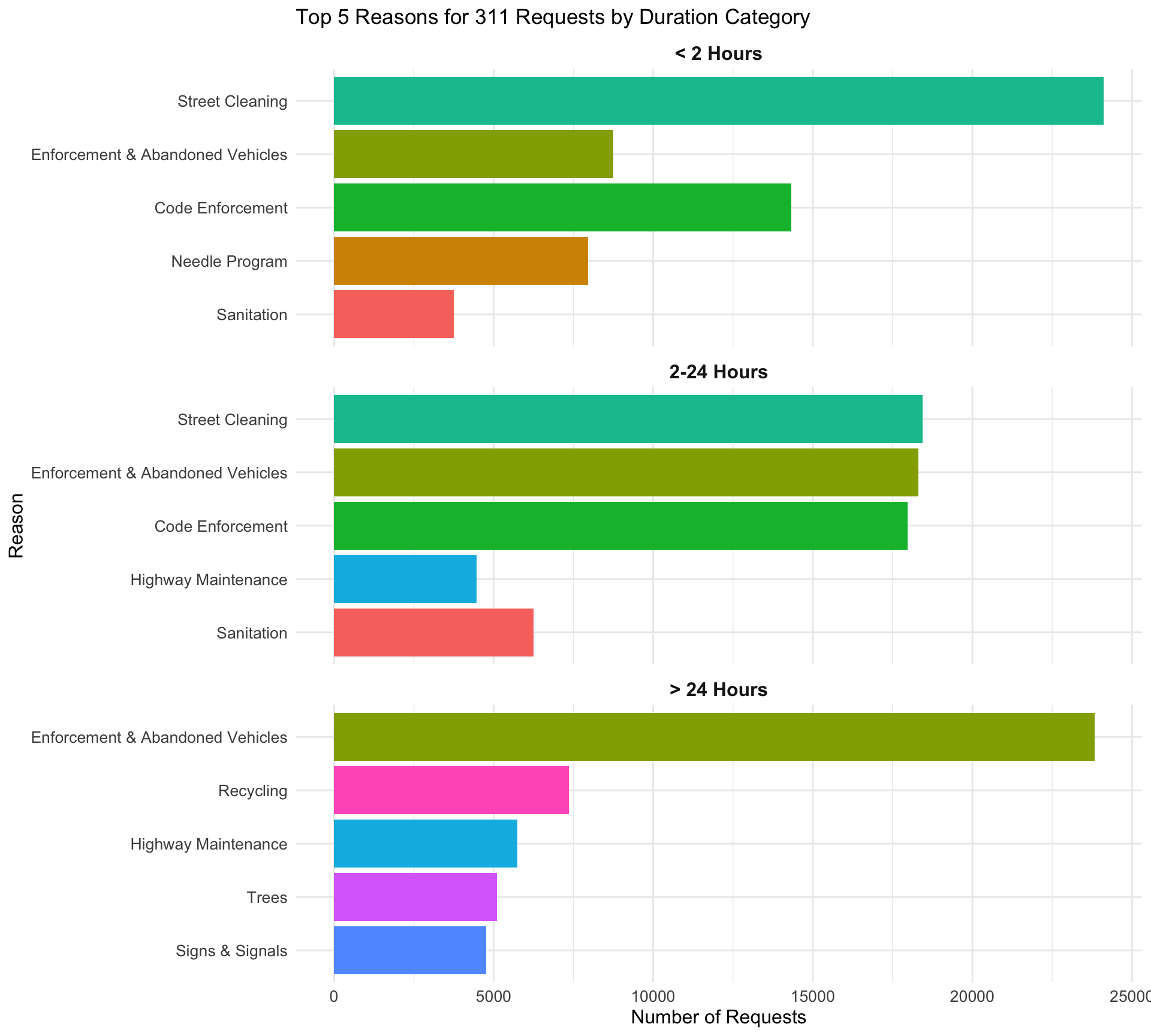 df <- df |>mutate(duration_category =case_when( duration_hours <2~"< 2 Hours", duration_hours >=2& duration_hours <=24~"2-24 Hours", duration_hours >24~"> 24 Hours" )) |>mutate(duration_category =factor(duration_category, levels =c("< 2 Hours", "2-24 Hours", "> 24 Hours")))# 2. Identify the top 5 reasons within each duration categorytop_reasons <- df |>group_by(duration_category, reason) |># Group by both category and reasonsummarise(count =n(), .groups ='drop') |># Count occurrencesarrange(duration_category, desc(count)) |># Arrange for descending countsgroup_by(duration_category) |>slice_max(order_by = count, n =5) |># Select top 5 per categoryungroup()# Optional: Ensure that 'reason' is a factor with levels ordered by count within each categorytop_reasons <- top_reasons |>group_by(duration_category) |>mutate(reason =fct_reorder(reason, count)) |>ungroup()top_reasons <- top_reasons |>filter(!is.na(duration_category))# 3. Create the faceted bar chartggplot(top_reasons, aes(x =fct_reorder(reason, count), y = count, fill = reason)) +geom_bar(stat ="identity", show.legend =FALSE) +# Create bars without legendfacet_wrap(~ duration_category, scales ="free_y", ncol=1) +# Facet by duration category with free y-scalescoord_flip() +# Flip coordinates for better readabilitylabs(title ="Top 5 Reasons for 311 Requests by Duration Category",x ="Reason",y ="Number of Requests" ) +theme_minimal() +# Use a minimal themetheme(strip.text =element_text(size =12, face ="bold"), # Style facet labelsaxis.text =element_text(size =10),axis.title =element_text(size =12) )