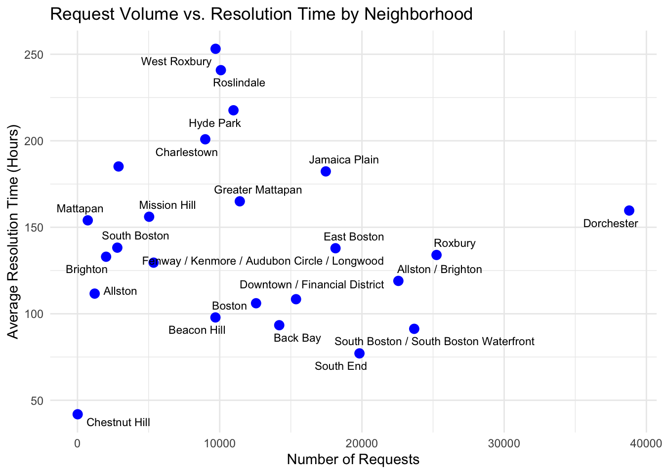 However, the graph identifies some outliers that deviate from this general trend. Notably, West Roxbury and Roslindale, neighboring areas located in the southwestern corner of Boston, exhibit higher-than-average resolution times. This clustering of high-resolution times in adjacent areas may be attributed to several factors, such as limited access to city resources, higher volumes of complex requests, or logistical challenges inherent to their geographic locations.